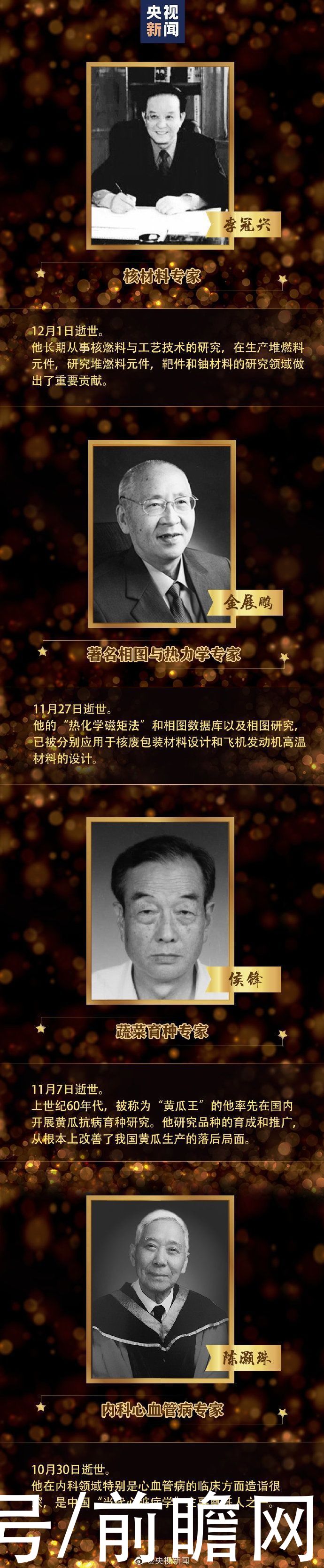 今年已经逝世的院士包括核材料专家李冠兴、著名相图与热力学专家金展鹏、蔬菜育种专家侯锋、内科心血管病专家陈灏珠、水利专家文伏波、雷达技术领域著名科学家保铮、著名化学家张俐娜、著名物理化学家刘若庄、理论物理学家戴元本等。