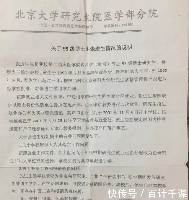 当医生的三年生活,使得张进生感到颇为挫败。为了实现“人人都不得病”的愿望,张进生决定继续深造。又经过三年时间的研习,张进生考取了北大的硕士研究生。在1995年硕士毕业后,张进生继续深造攻读博士学位。读书对于张进生而言,就像一架稳稳当当的梯子,他只要顺着往上爬就可以了。读博最后一年,张进生又收到了英国一皇家医学院的录取通知书。然而他的求学之路却戛然而止于此。