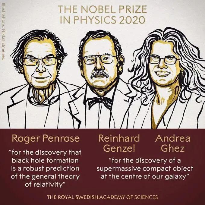这三位科学家正是在这一领域做出了开创性的贡献。据诺贝尔官网介绍,罗杰·彭罗斯因发现黑洞的形成是广义相对论的可靠预测而获奖。莱因哈德·根泽尔、安德里亚·格兹这两位科学家发现了银河系中心的超大质量天体。