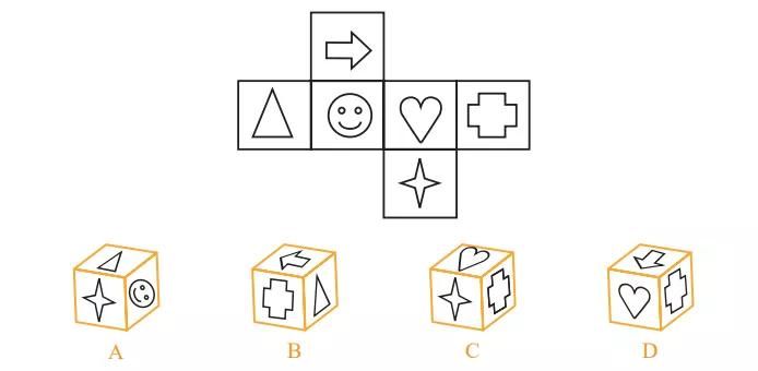 在此基础上,教师可以扩展课堂教学的环节,提升难度,让学生对空间的认知走向深度。比如展示每个面上都有不同图案的正方体展开图,让学生仔细观察,在头脑中将二维展开图转换为三维立体图,再从四个选项中找出错误的立体图。