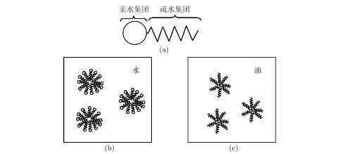 图4(a)表面活性剂分子;?(b) 水中形成胶束;?(c) 油中形成反胶束