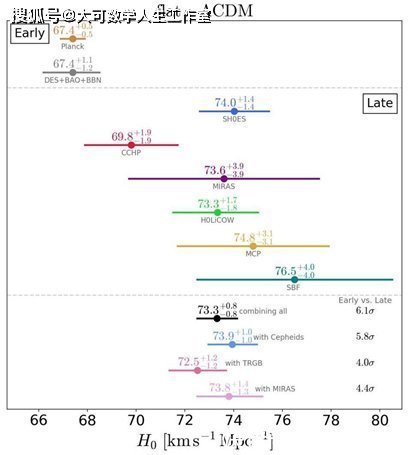 一系列不同类型的小组试图测量宇宙的膨胀率以及对应的彩色编码结果。请注意,早期(前两项)和晚期(其他项)结果之间有很大的差异,每个晚期选项的误差线要大得多。唯一一个受到攻击的值是CCHP,经过重新分析,发现该值比69.8更接近72公里/秒/英里。