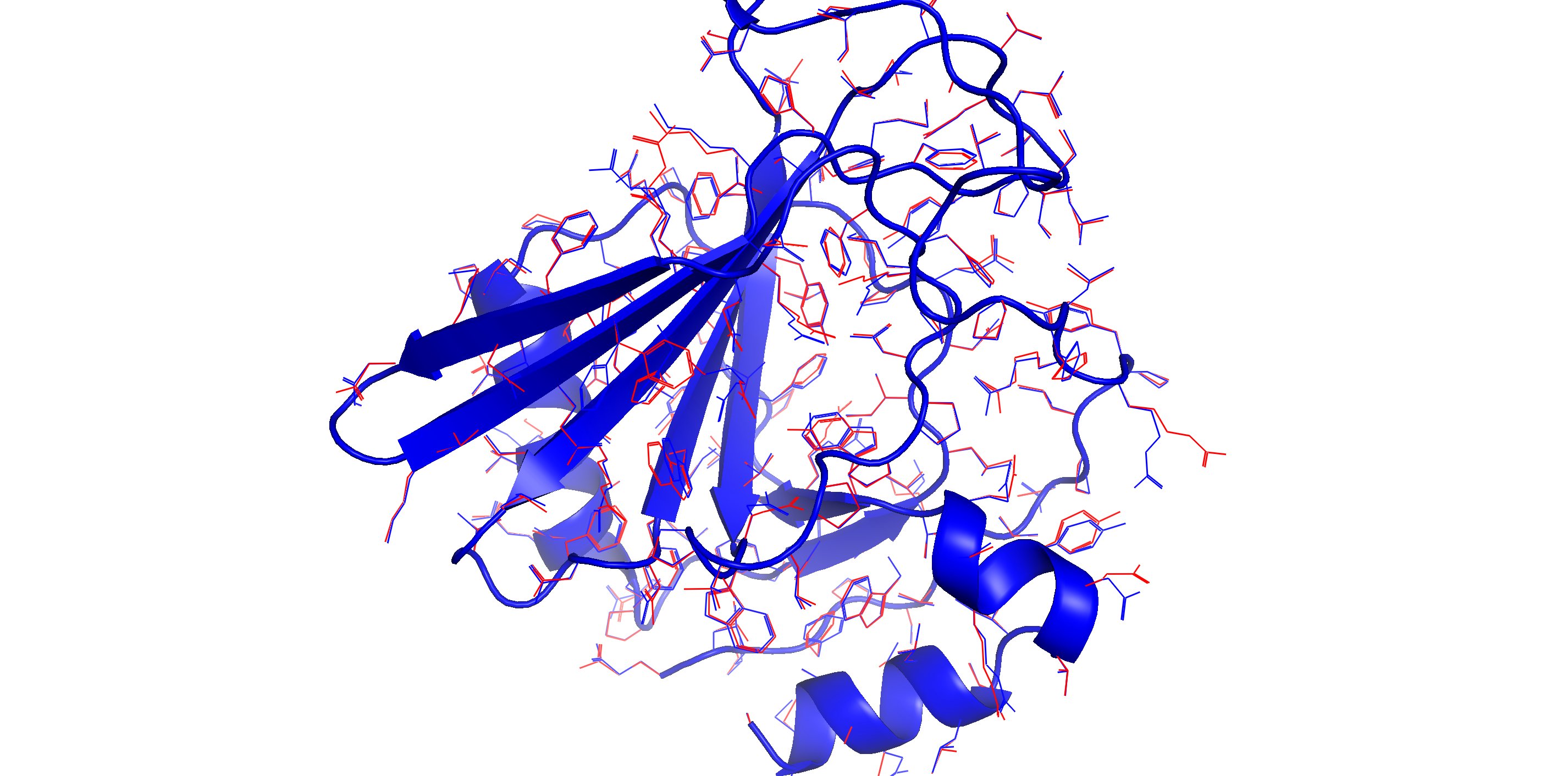 复旦团队根据已知蛋白质主链进行侧链建模的结果:蓝色为目标结构,红色为预测结构。